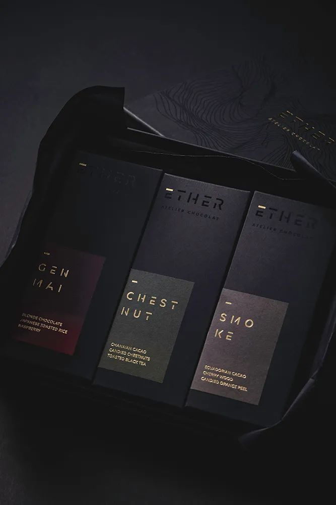 ether atelitr巧克力是來自印度的品牌,他的包裝設計使用微妙的黑色和金色美學以及設計的版式反應巧克力的純正,體現品牌輕奢的理念。豐富、安靜的細節化處理,反映出該巧克力的手工精神和該品牌的市場唯一性。